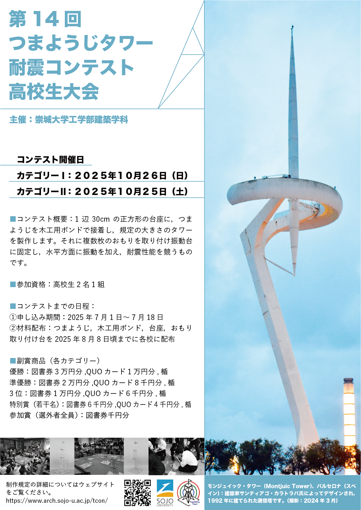 第14回「つまようじタワー耐震コンテスト高校生大会」は、 2025年10月25日および26日に開催されました。 カテゴリーTに18校57チーム、カテゴリーUに9校33チーム、計90チームと 県内外より多数の申し込みをいただき、ありがとうございました。